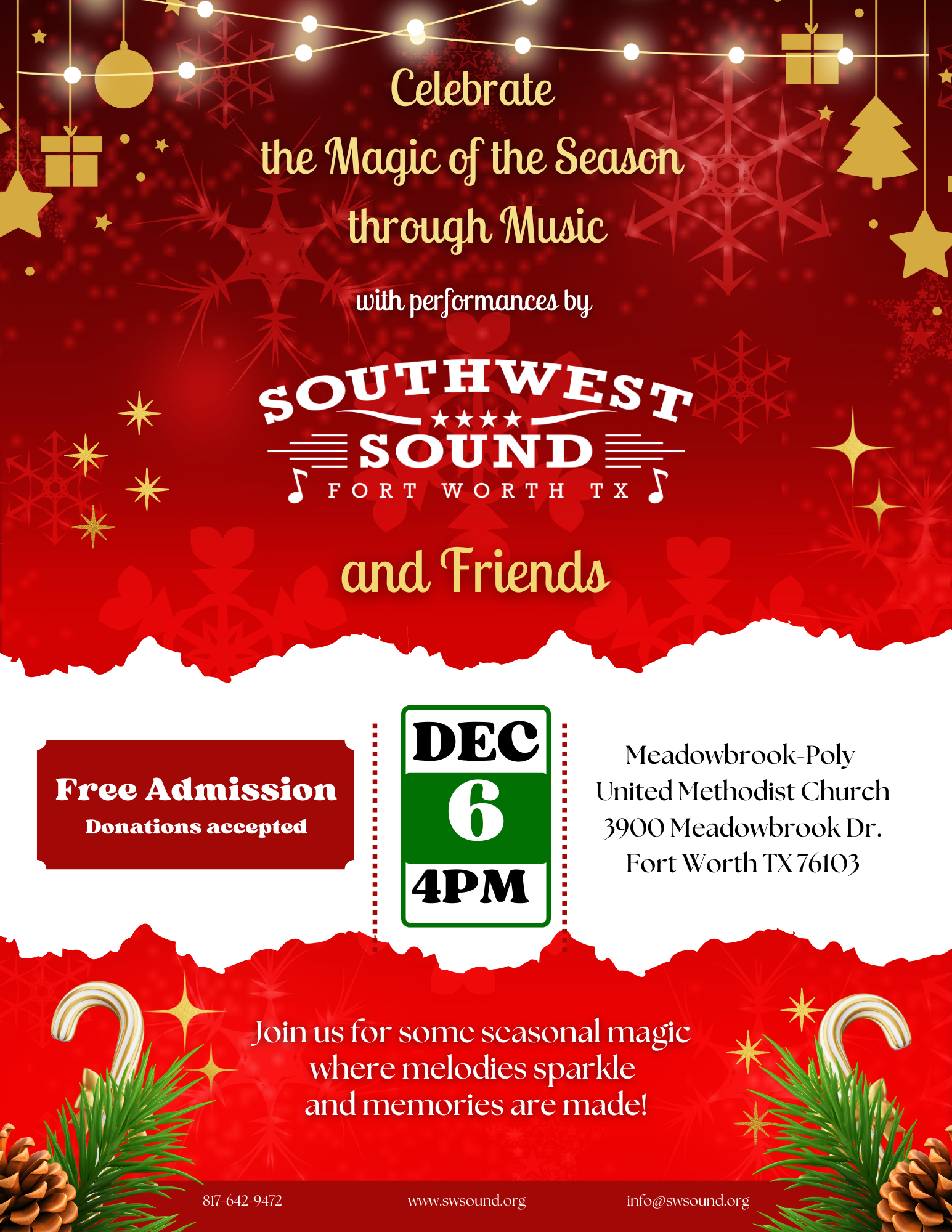 Southwest Sound, the performing chorus for the Fort Worth Chapter of the Barbershop Harmony Society (BHS), is an a cappella chorus based on the four part close harmony barbershop style of singing. We have been providing entertainment in the Dallas-Fort Worth Metroplex and surrounding areas since 1952..